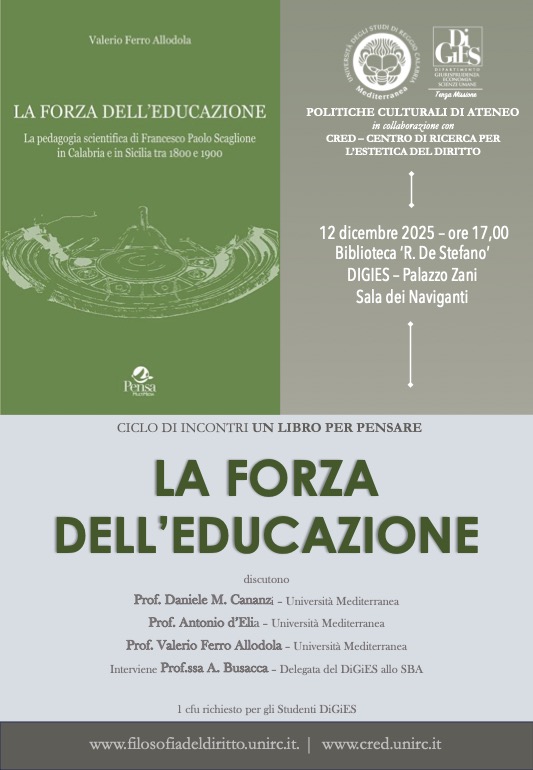 Il CRED, Centro di ricerca per l’estetica del diritto, avvia le proprie attività nell’a.a. 2011-2012 e viene formalmente costituito nel 2012 con delibera del Dipartimento di Scienze Storiche, Giuridiche, Economiche e Sociali (oggi Dipartimento di Giurisprudenza ed Economia) e sotto gli auspici della Facoltà di Giurisprudenza dell’Università Mediterranea di Reggio Calabria.